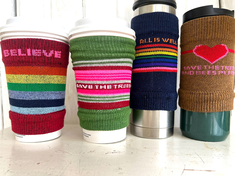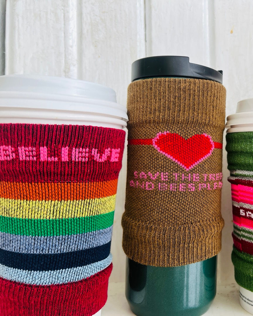 Our Cozy Believe Sleeves are made of recycled cotton with the help from our friends in Minneapolis. All orders benefit Adore Your Planet and our fundraising partners, HippyFeet supporting homeless youth, and the Bee Wild Seed Company supporting pollinator health.
